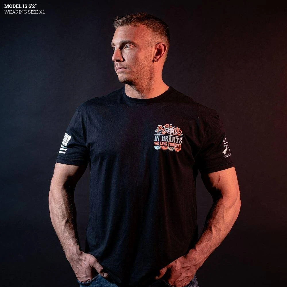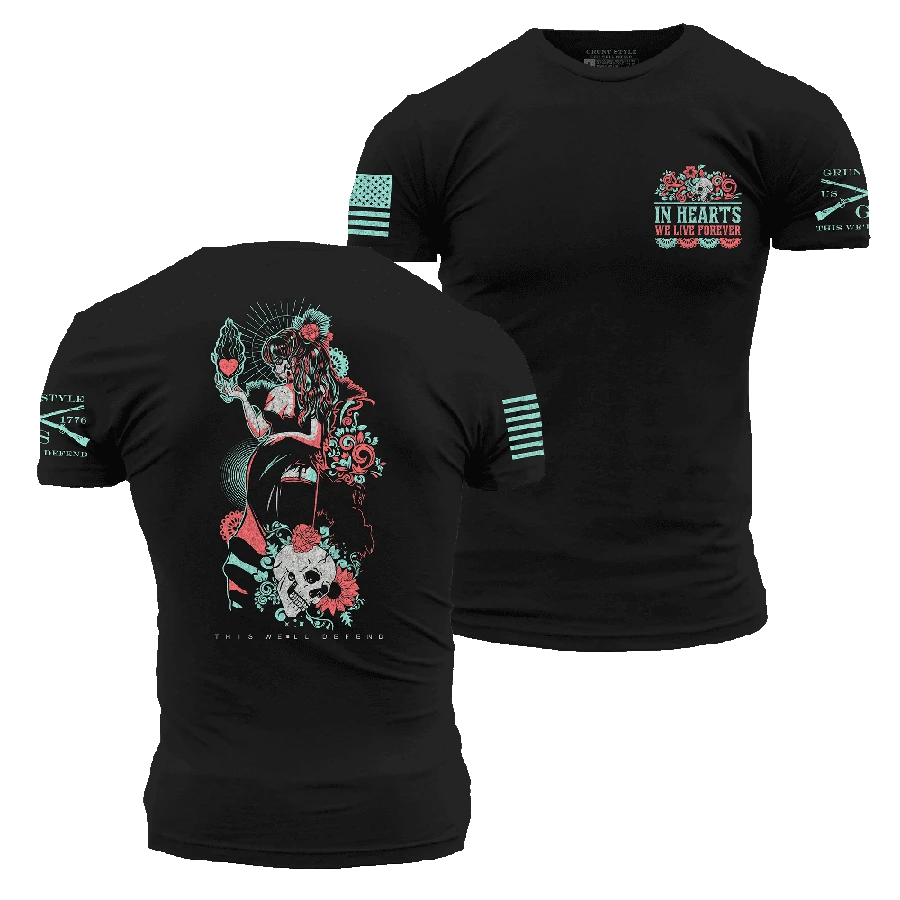 Show your appreciation for the loved ones who have gone before us with our In Hearts We Live Forever T-Shirt. Featuring a Día de Muertos design, this shirt is a strong reminder that those we love remain with us forever, in our hearts. Honor their memory, and celebrate life!