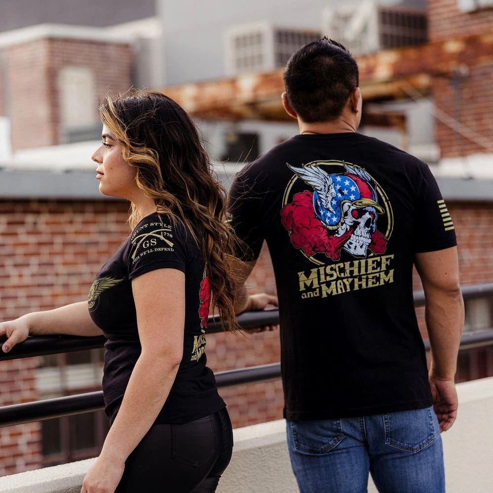 Show off your American pride and sense of adventure with this Mischief and Mayhem T-Shirt. Featuring a patriotic design, this stylish tee is a must-have for any speed demon who’s ready to cause a little mischief! Embrace the rebellion and express your inner badass today.