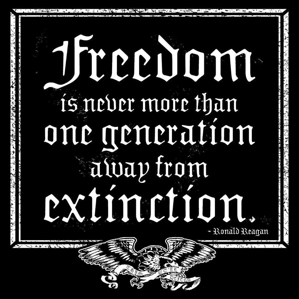 Ronald said it best. It’s more than just a quote, it’s a fact! As Americans, we must stand united and continue to maintain the great nation that generations before us have worked so hard to build. Acknowledge and remember the history of the United States, so that we never fall and repeat ourselves. Order this “One Generation Away” pocket tee and continue to do whatever it takes to protect our freedom.