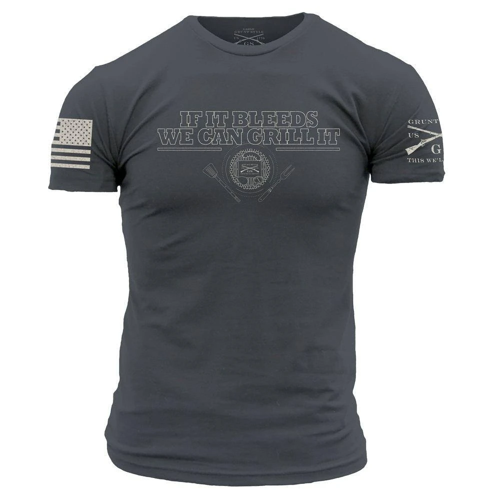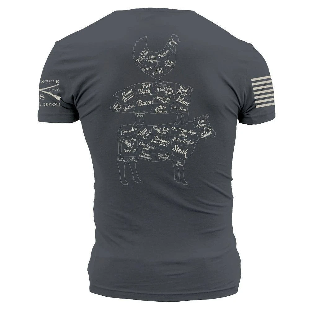 This grey shirt features every cut on a pig, cow, and chicken on the back and features the assaulting American Flag and Grunt Style logo on the sleeves. No self-respecting griller should be without this shirt! Get one for yourself or for your favorite griller!
