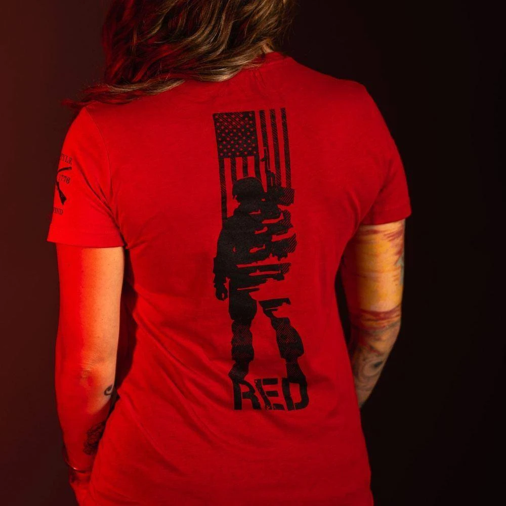Remember the sacrifices, remember the deployed! Show your support for our military personnel with this Women’s R.E.D. All Forces T-Shirt- Red.
